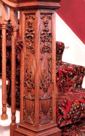Miscellaneous interior details![]() Fluted Tuscan pilaster ![]() Feathered wrought iron sconce ![]() Beamed ceiling ![]() Wooden newel ![]() Carved wooden newel: flaming urns ![]() Fireplace constructed of cultured (concrete) stone by current owners ![]() Cultured (concrete) stones ![]() Attic wooden traceried window ![]() Second floor bedroom porch as seen through a screen |