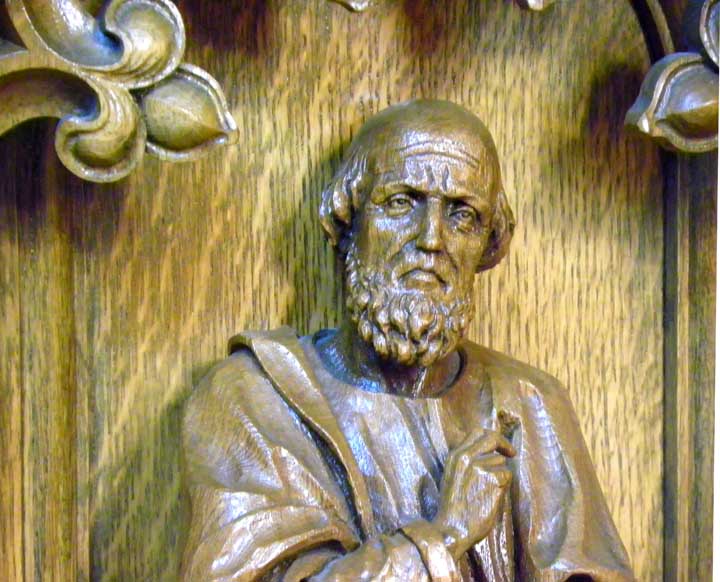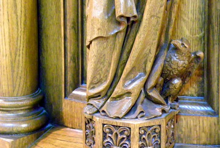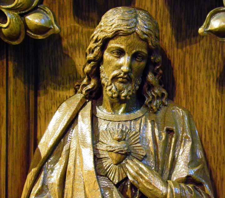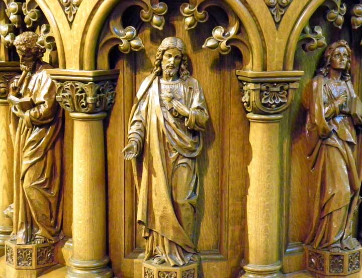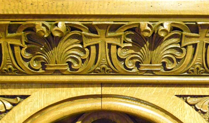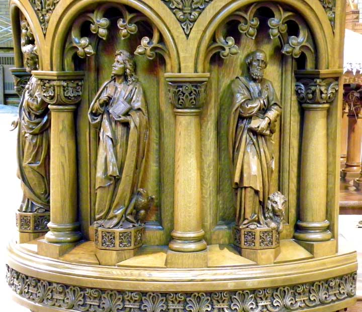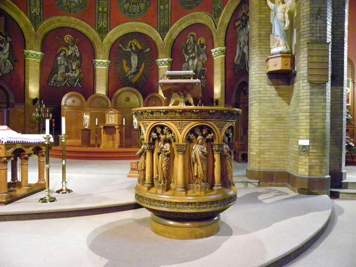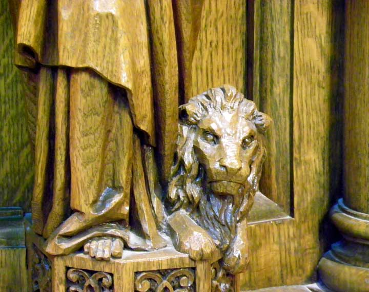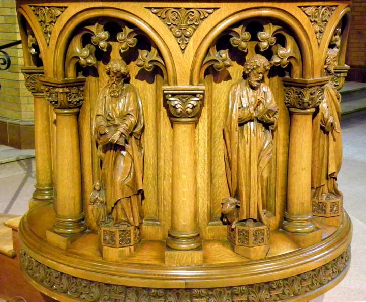 ![]() Apse ..... Sanctuary ..... Ribbed vault ..... Rounded arches are a prominent feature of Romanesque Revival architecture ..... Pulpit in lower right ![]() Top carved, oak molding features cross pattée and palmette leaves ![]() Left: Evangelist Matthew. Note carving of a man at the bottom left Right: Evangelist Luke. Note carving of an ox at his feet. ![]() Left: Evangelist Matthew. Note carving of a man at the bottom left Center: Sacred Heart of Jesus Right: Evangelist Mark. Note carving an an ox at his feet. ![]() Detail - Sacred Heart of Jesus ![]() Left: Sacred Heart of Jesus Center: Evangelist John. Note carving of an eagle at his feet. Right: Evangelist Mark. Note carving of an lion at his feet. ![]() Detail - Evangelist John. ![]() Detail - Evangelist Mark ![]() Detail - Evangelist Mark |