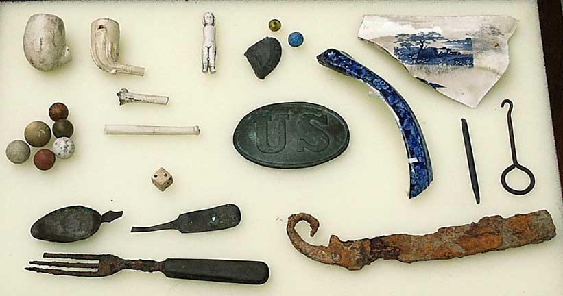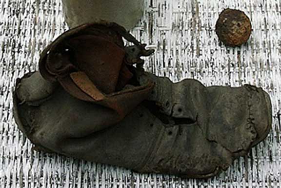 ![]() Buried artifacts found on property, especially in the crawl space: Ice skate blade ... Ladies' button hook ... Pencil ... Hand-hammered spoon ... Indian beds (trade beads) ... Civil war buckle probably belonging to the son of house's owner ... Bisque pipe bowls and stems (sold in taverns) ... Doll ... Bone die ... Black chert (flint) Indian scraper (for fish, etc., usually carried in a pouch) ... Grape shot, possibly used in the War of 1812 battles which took place several blocks away near the Niagara River ![]() John Howell clay beverage container bottle; c. 1850. Howell owned a bottling plant on South Division St. John was related to Stephen Howell who owned the house still standing on Dearborn and Amherst Streets. ![]() Closer view of shoe. Note stitching in front and side. Probably thrown in the attic for good luck (an old German custom) |
