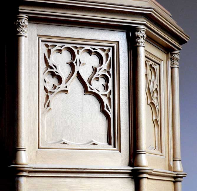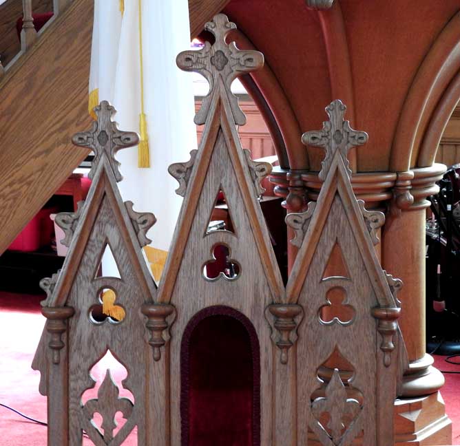 Chancel![]() Chancel Details below: ![]() Chancel Tracery: Alpha and Omega ... Cross bottony ![]() Chancel Organ ... Pulpit ... Nave pews ![]() Chancel Staircase on pulpit features turned balusters ![]() Chancel Pulpit ... Two details below: ![]() Chancel Pulpit detail: Engaged columns ... Trefoils and cinquefoil tracery in each panel ![]() Chancel Pulpit detail ![]() Chancel Chair: Gothic Revival back (detail below:) ... Arms with knuckled handholds with gooseneck supports ... Rococo Revival cabriole legs ![]() Chancel Gothic Revival chair back: Cross botany finials ... Triangles ... Trefoils ... Fleurs-de-lis ![]() Chancel Organ ![]() Chancel Choir seating ![]() Chancel Baptismal font (detail below:) ![]() Chancel Baptismal font detail |