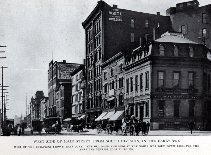 Photo - West Side of Main Street, From South Division in the Early '80's White Building: Caulkins design. Reprinted from The Picture Book of Earlier Buffalo, Frank H. Severance, ed. Pub. by the Buffalo Historical Society Publications, Vol. 16, 1912, p. 154