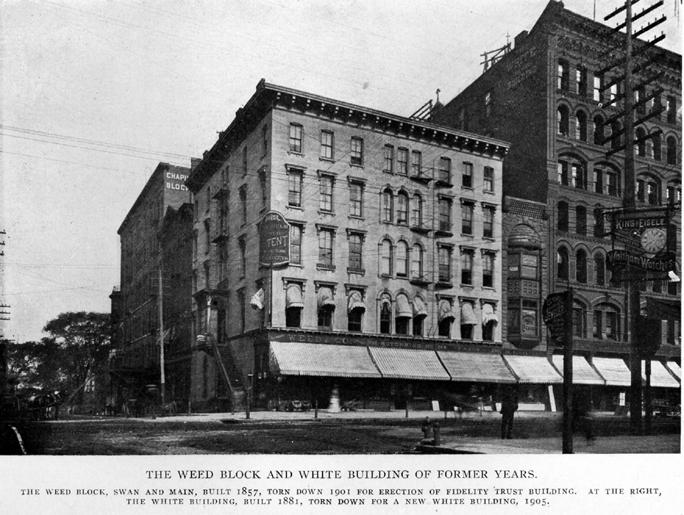 Photo - The Weed Block and White Building of Former Years White Building: Caulkins design. Reprinted from The Picture Book of Earlier Buffalo, Frank H. Severance, ed. Pub. by the Buffalo Historical Society Publications, Vol. 16, 1912, p. 152