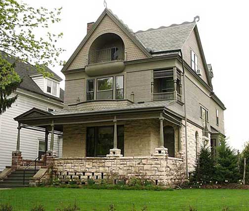 Thomas Jones House, 242 Norwood Avenue. The house displays the typical massing and multiple gables of the late Queen Anne. The flat-roofed veranda with classically ordered columns reflects the Beaux Arts style which was popularized by Chicago's World's Columbian Exposition of 1893.
