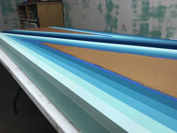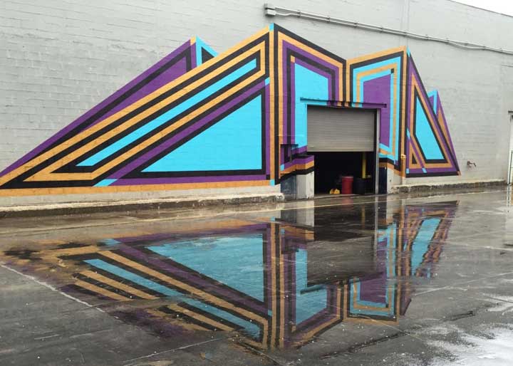 Although he used to have more of a bent on realism, Miller has been focusing on geometric patterns for his most recent murals. “This focus is just kind of like an intense look at wrapping and changing form and using light and gradients and line work to completely alter architecture.