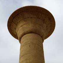 Most of the time, the columns shafts were copies in stone of supports made from plants, resembling either a trunk or a bundle of stems of smaller diameter. Also the shape of the capital, the top of the column, also had a plant theme, and at the transition of the capital to the shaft, five bands might be found representing the lashing which held together the bundle of stems of which the earliest columns were made. Above the capital a low abacus usually connected the column to the architraves placed above it.