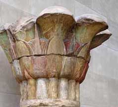 Papyrus column: bundled papyrus stalks (painted red, largest), palmettes, and closed buds (lotus?) |