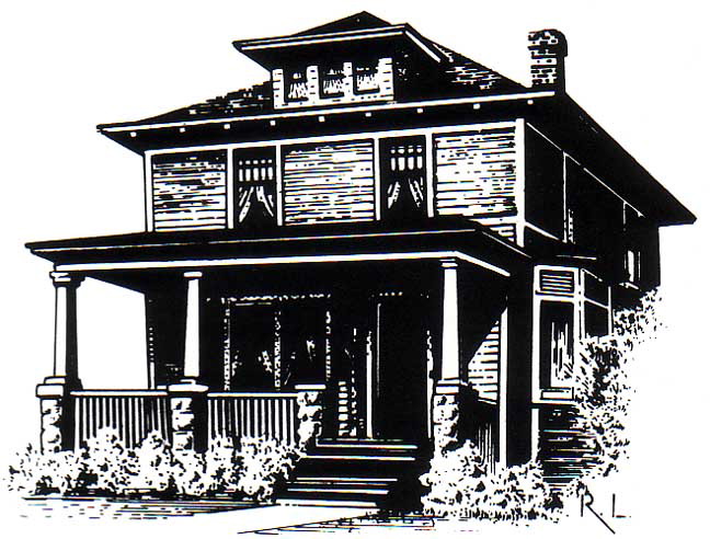 A sturdy early 20th century style of the middle class. Typically two story, square and box like, with low hipped roof and overhanging eaves. Often with dormer and full porch.