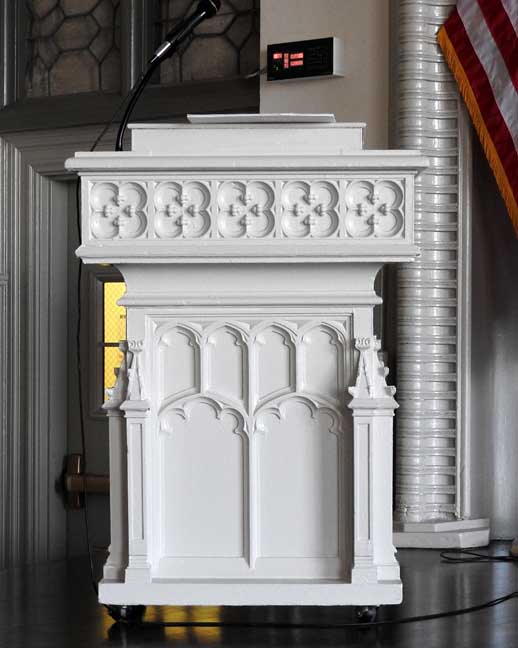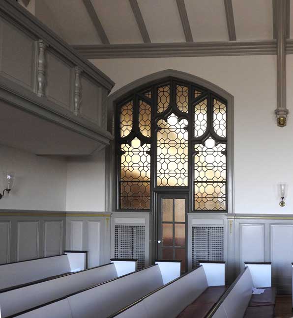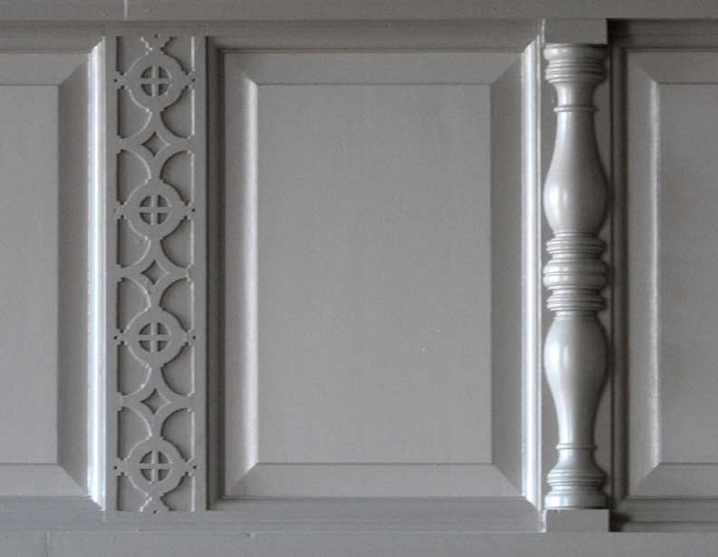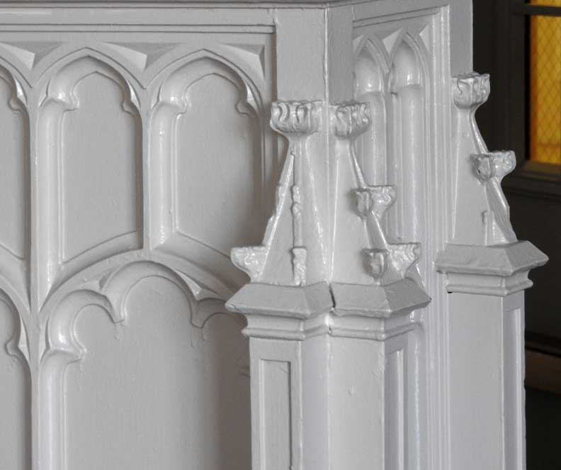 2017 Photos ![]() ![]() Podium decorated with quatrefoils, trefoils, cinquefoils, and corner buttresses ![]() Podium decorated with trefoils, cinquefoils, and corner buttresses ... Crockets ![]() ![]() Gilded corbel ![]() ![]() Gilded corbel ![]() Rear balcony and coffered ceiling ... Strapwork detailed below: ![]() Strapwork includes C scrolls ![]() Rear of chapel with balcony above ![]() Leaded glass with tracery ... Note carving on balcony (detailed below:) ![]() Strapwork ... Turned, engaged double vase-shaped baluster |