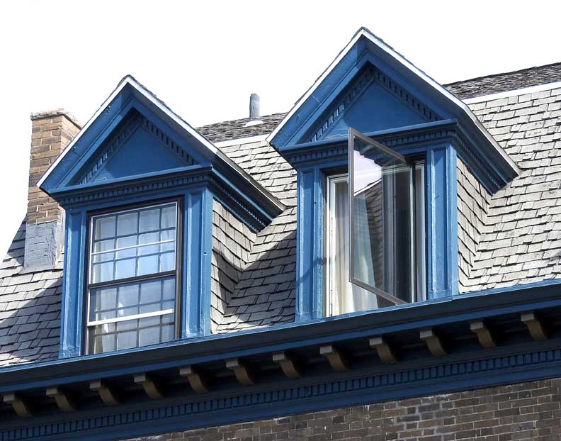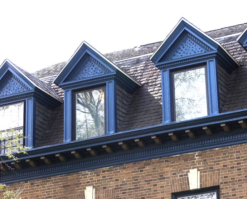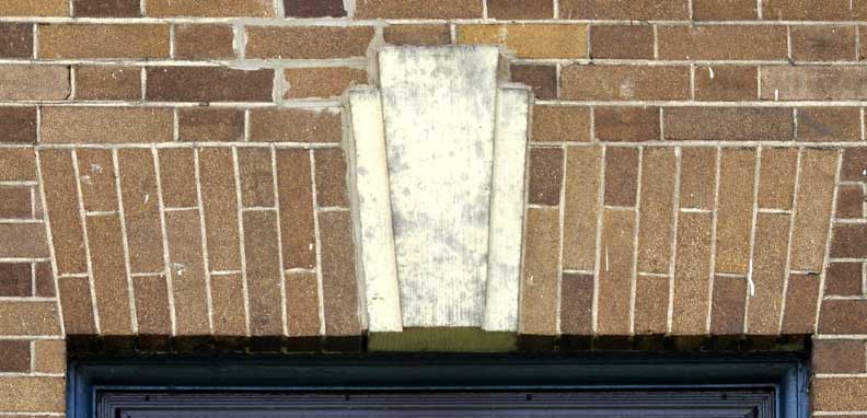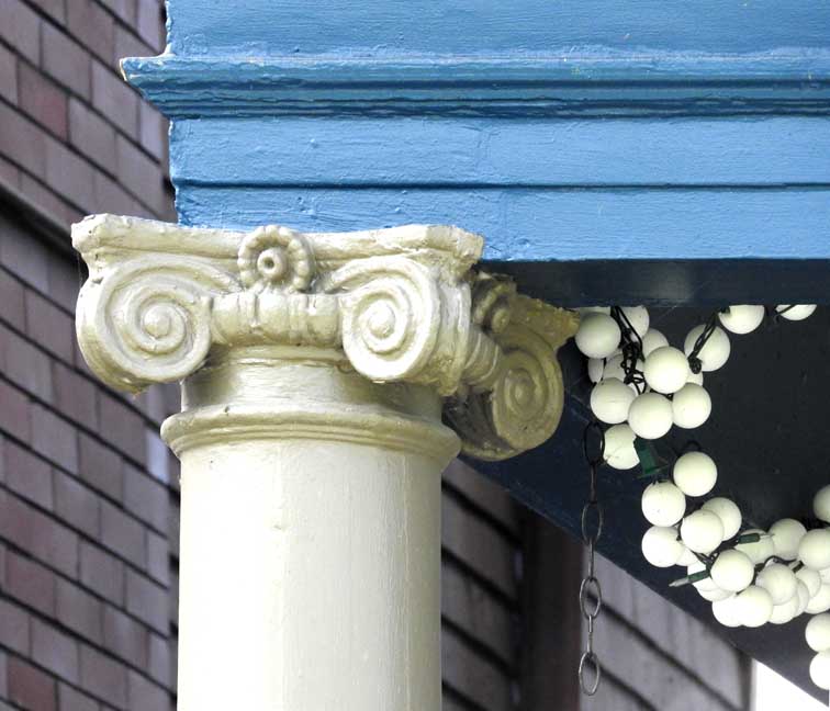 2017 Photos![]() ![]() Side gable roof ... Colonial Revival style ... Majority 12/1 double hung sash wood windows ... Four pedimented dormers ![]() Colonial Revival style dormers: Dentil molding and pebble dash inside tympanums with paneled pilasters ... Cornice supported by modillions and dentil molding below ![]() Left: 12/12 lights ... Right: casement window (not original) ![]() Dentil molding and pebble dash in tympanum ... Modillions ![]() Flemish bond brick pattern ... Lintel: keystone in the middle of a flat arch/jack arch ![]() Offset entry with leaded side lights under partial width flat roof portico with Ionic column supports on solid shingle balustrade ![]() ![]() Ionic column capital and upper shaft ... White balls are decorative lights ![]() Flemish bond brick pattern ... Leaded glass side light panel |