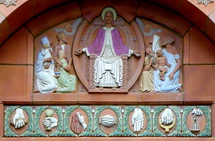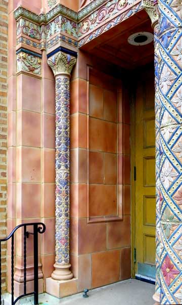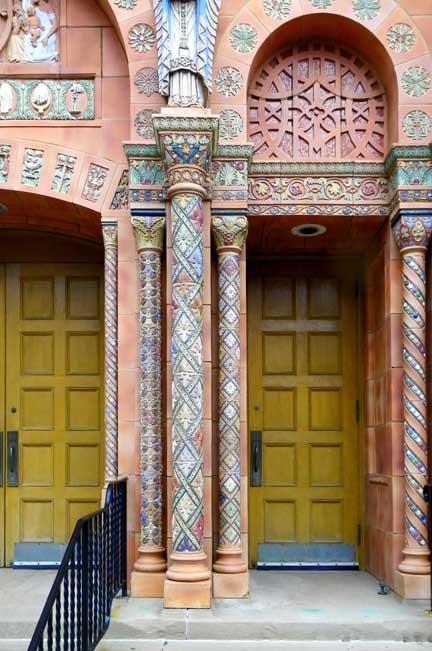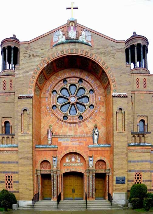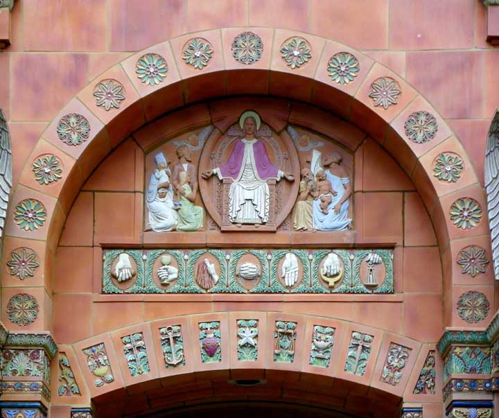 Entrances ![]() ![]() St Casimir distributing alms and bread to the needy. Symbols for the Seven Catholic Sacraments: Baptism / Penance (Confession) / Holy Eucharist / Confirmation / Matrimony / Anointing of the Sick (known prior to Vatican II as Extreme Unction or "Last Rites") / Holy Orders ![]() Angel Praying the Rosary ![]() ![]() Terra cotta columns and wall cladding ![]() |