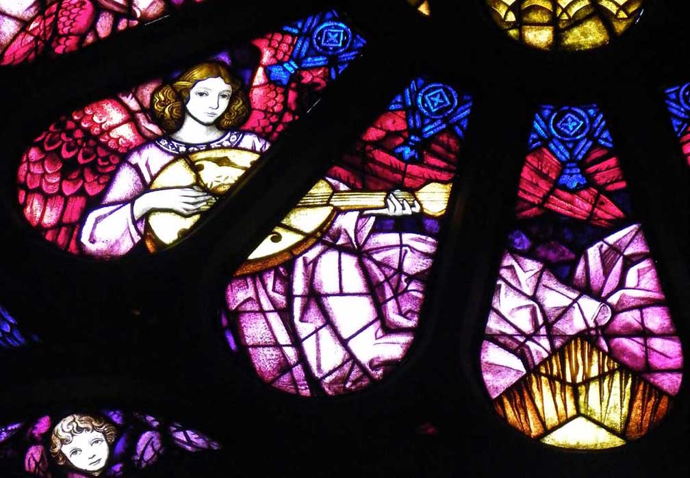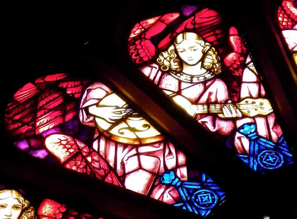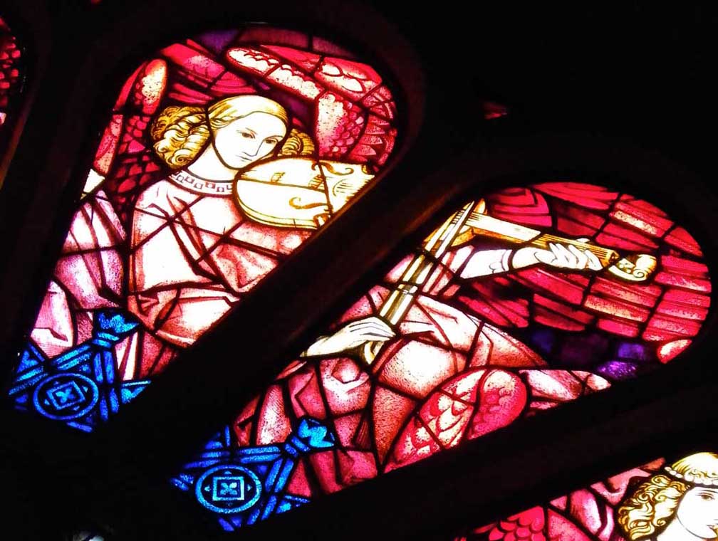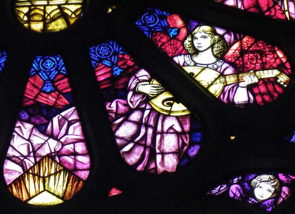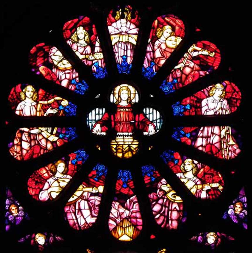 In July 1969, the exterior of the entire wheel window was repaired and cemented, and a protective clear plastic-glass shield was used to cover every section of it.The subject matter of choir loft windows typically involves music. Here, the central figure is St. Cecilia playing an organ. (St. Cecilia is the patron saint of musicians and church music because she praised God, singing to him, as she lay dying a martyr's death.) She is surrounded by angels playing various instruments.
