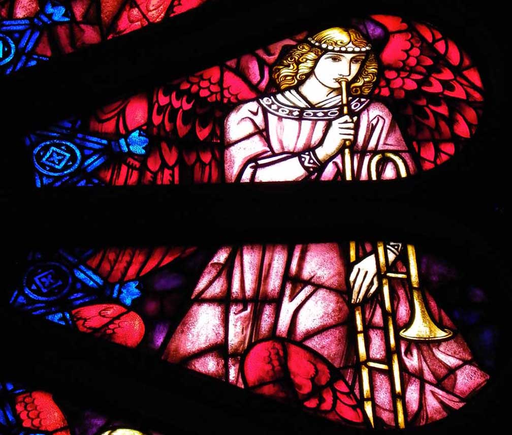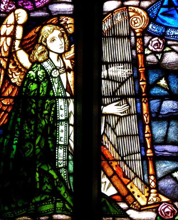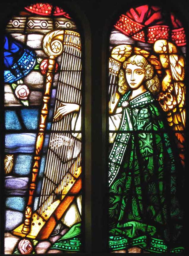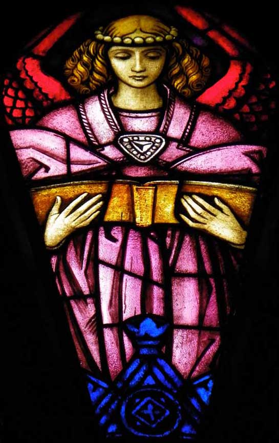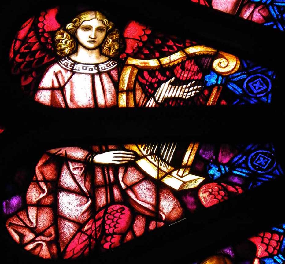 In July 1969, the exterior of the entire wheel window was repaired and cemented, and a protective clear plastic-glass shield was used to cover every section of it.The subject matter of choir loft windows typically involves music. Here, the central figure is St. Cecilia playing an organ. (St. Cecilia is the patron saint of musicians and church music because she praised God, singing to him, as she lay dying a martyr's death.) She is surrounded by angels playing various instruments.