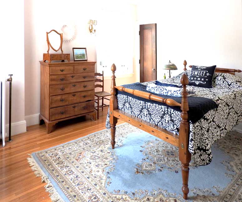 floor![]() Colonial Revival balustrade ![]() Palladian window (top spiderweb muntins detailed below:) ![]() Spiderweb lead muntins ![]() Queen Anne style pine highboy ... Two details below: ![]() Detail #1: Queen Anne style pine highboy ... Shell with ball pull handle ... Ornamented apron ![]() Detail #2: Queen Anne style pine highboy ... Queen Anne style cabriole legs with pad feet ![]() Master bedroom features ceramic fireplace tiles ... Two details below: ![]() Detail #1 - Ceramic tile fireplace hearth ![]() Detail #1 - Ceramic tile fireplace surround detail ![]() Tiger maple chest of drawers Shortly after the Restoration in England (1660) the first chest of drawers appeared and were usually fitted with three long drawers and two small ones at the top. The drawer fronts should be graduated in depth with the largest one at the bottom and the smallest at the top, with about one inch in difference in each case. ... Detail below: ![]() Detail - Tiger maple chest of drawers ... Willow mounts with bail handles ![]() ![]() ![]() ![]() Drop leaf table ... Two details below: ![]() Detail #1 - Drop leaf table ... Crotch mahogany(?) veneer on drawers ... Mushroom-turned wooden knobs ![]() Detail 2 - Double drop leaf table ... Tiger maple turned legs ![]() Horse and chest-of-drawers ... (Both detailed below:) ![]() ![]() Tiger maple ... Mushroom-turned wooden knobs ![]() Mirror on chest-of-drawers ... Rope bed ... (All detailed below:) ![]() Mirror on chest-of-drawers ... Acorn(?) finial ![]() Mirror ... Tiger maple ... Serpentine front ![]() Chest-of-drawers ... Willow mounts with bail handles ![]() Chest-of-drawers ... Bracket foot ![]() Tiger maple ... Rope bed ... Headboard ... Four finials ... Two details below: ![]() Detail #1 - Tiger maple rope bed ... Acorn(?) finial ![]() Detail #2 - Tiger maple rope bed ... Note rope holes |