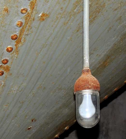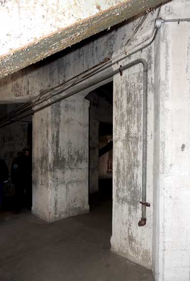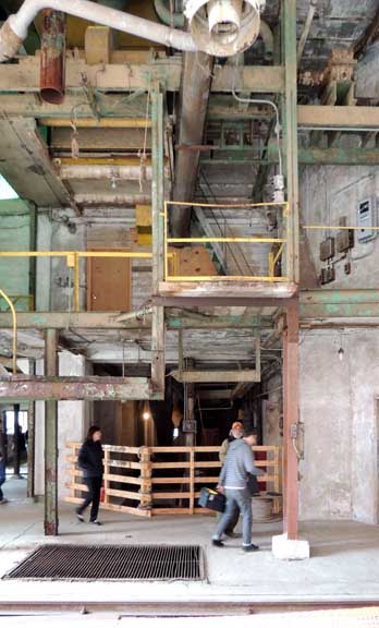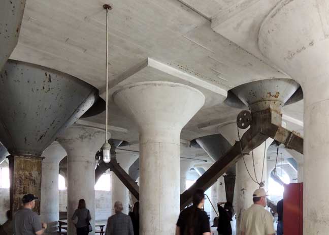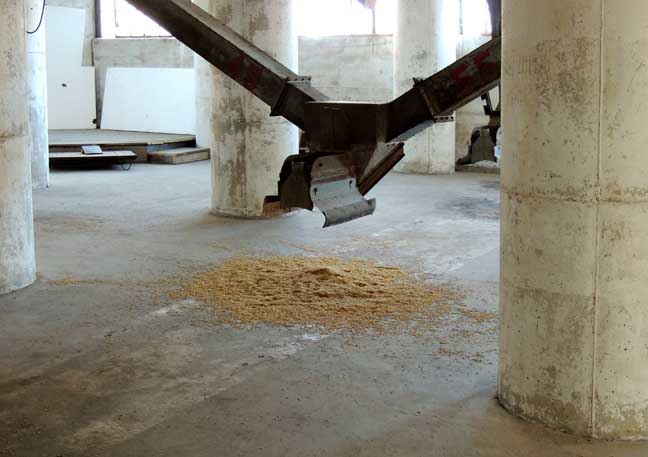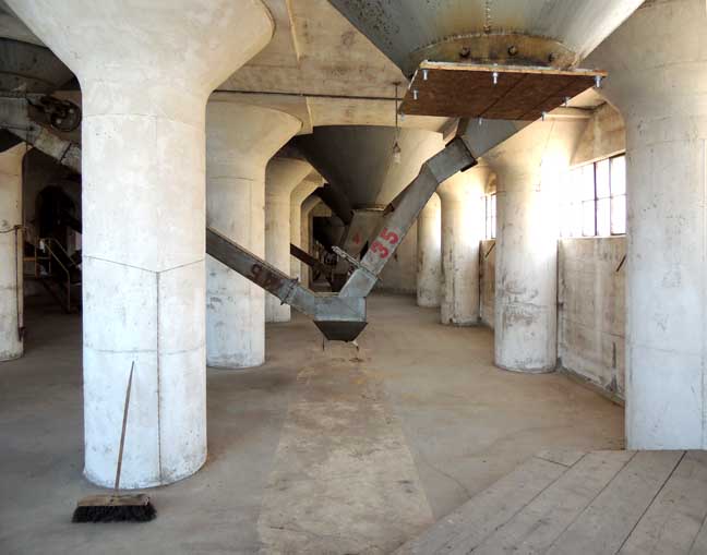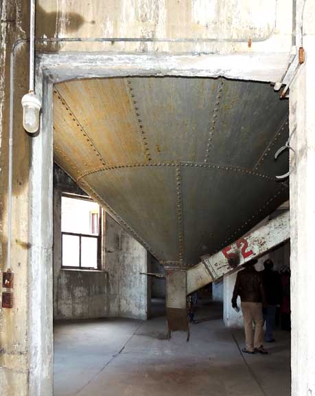 Elevator basement![]() 1907 hopper (a steel, tapered container found on the bottom of each bin/silo for easy unloading). A horizontal conveyor belt would have been positioned below the hopper. Note the concrete piers. ![]() 1907 steel hopper detail ... Light bulbs were enclosed for safety purposes. ![]() 1907 reinforced concrete piers. ![]() Instead of 1907 style reinforced concrete support piers, the 1933 annex used reinforced concrete piers. ![]() Note two different sizes of hoppers. The smaller hoppers are at the bottom of the smaller interstitial silos. ![]() Smaller interstitial hopper ![]() Barley on the floor fallen from a silo and hopper above. There is still [2013] some barley stuck to the sides of the silos, and, occasionally, some falls. |