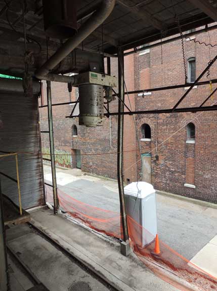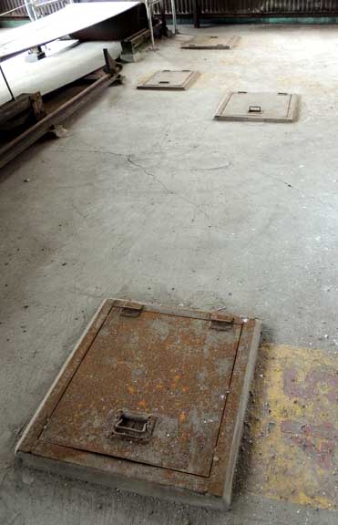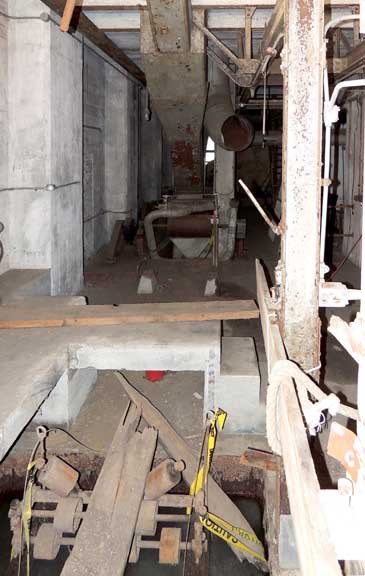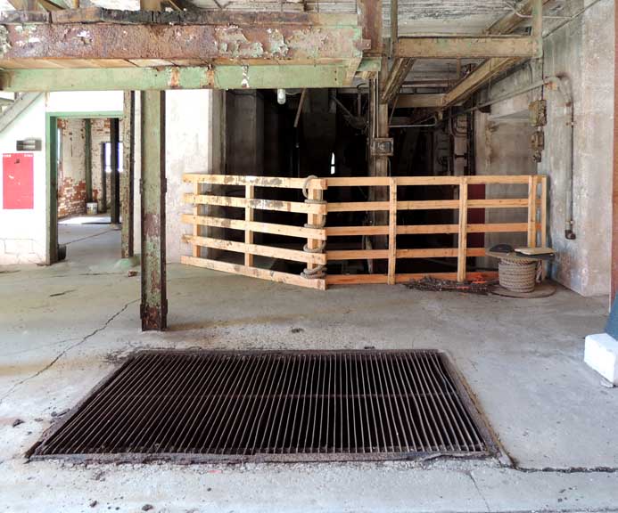 Grain Receiving ![]() Note railroad tracks to the immediate right of the Perot workhouse and silos in center of photo. Rail cars unloaded grain into a pit in the workhouse. A lofter scooped the barley from the pit up the workhouse for weighing and for distribution to the bins. Photo source: 1994, by Jet Lowe, found on HABS (online March 2013) ![]() Perot was built without marine legs. Until 1933, it used rail transportation to receive barley for malt production. This is where barley was unloaded from a rail car and dropped into the grated pit. Note one rail at bottom of photo. ![]() Grated gravity pit that extends into the building. Rail cars unloaded barley here into the pit. ![]() Note rollers where a horizontal conveyor belt on rollers would have carried the barley from the grated gravity pit into the building. In the gravity gravity pit barley