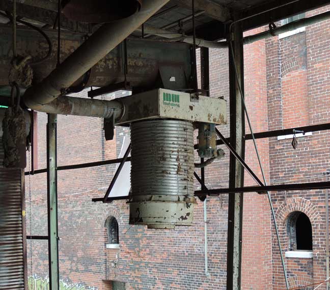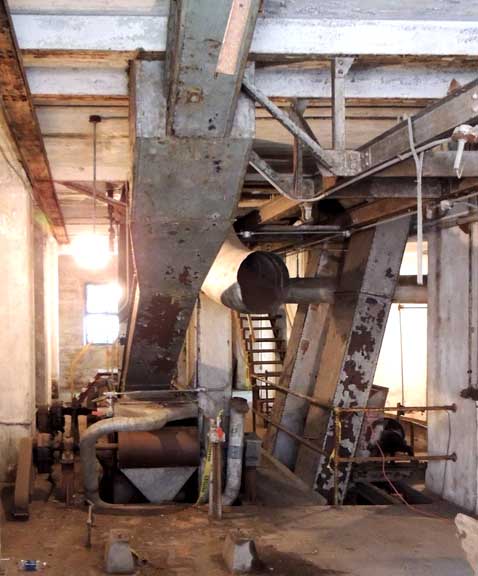 This lofter (internal legs for the transfer of grain from the lower to the upper systems of horizontal conveyors) takes the barley up to the workhouse where it enters the 3,000 bushel garner-scale unit. From the scale, grain is dropped either to the 40" wide bin floor belt or transfered to the cleaning and grading area. From grading barley is transfered to bins for storage until transfer to the malthouse. "The grain is dumped from a truck through the grates. The area below the grate is called the pit. The leg [lofter] runs from the pit to the head house. On the leg is a thick rubber belt with buckets or cups. When the leg is started, the belt will move through the pit. The cups will fill up the grain and take it to the head house. As the leg reaches the top, it will arch, the cups will be up side down. When the cups turn to go back down towards the pit, they empty the grain on a conveyor belt. The cups will be facing downward, until the cups reach the pit and the will right themselves, filling up with more grain. The run is the conveyor belt between the elevator and a storage annex." - Gary Rich, How does a grain elevator work? (online April 2013) ![]() Diagonal lofter (internal legs for the transfer of grain from the lower to the upper systems of horizontal conveyors) is at top right. ![]() Diagonal lofter is at right. For another illustration of a lofter, see Perot elevator building. |