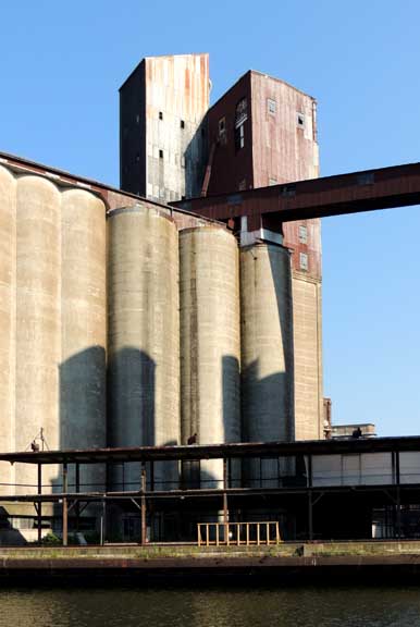 When Genesee Brewing Co., through its subsidiary Fred Koch Malting Company, purchased the Perot complex elevator, the malt was hauled to Rochester, New York, to be brewed along with other ingredients into Genesee Beer. Photo source: 1994, by Jet Lowe, found on HABS (online March 2013) ![]() Same scene in 2013 Mainhouse/elevator ... Bridge ... Brick malthouse ![]() Perot workhouse and elevator. behind. In front of the workhouse is the sacking shed. Photo source: 1994, by Jet Lowe, found on HABS (online March 2013) ![]() Same scene in 2013. Left bridge between American Elevator and Perot. Right bridge between Perot mainhouse and malthouse. Top mainhouse detail in next photo below: ![]() Head house / Workhouse. Lower section: Reinforced concrete ... Upper section: Steel structure covered with corrugated steel. Traditional layout and design of