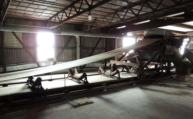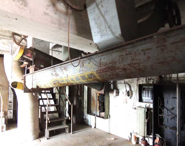 Elevator gallery/bin deck Gallery: A floor in the headhouse known as the "bin deck" at the same level as the silo tops. There were two parallel conveyor belts that carried grain outbound from the headhouse where the grain was diverted off the belt with a "tripper" into a selected silo for storage. ![]() ![]() Horizontal conveyor belt with doors to bins below ![]() Horizontal conveyor belt with tripper at right. This traditional elevator employs belt conveyors with a movable tripper which diverts grain off the belt and into the desired bin below. The belt and tripper combination is located above the silos in an enclosed structure called the gallery or bin deck. ![]() When the tripper is positioned over one of the doors to bins below, grain is released from the tripper and the grain falls into the silo. ![]() When a silo had a lot of grain stuck on the sides, a worker was lowered into the silo on a swing through the door illustrated above who then scraped the silo clean. ![]() Note the handle and the swing seat. |
