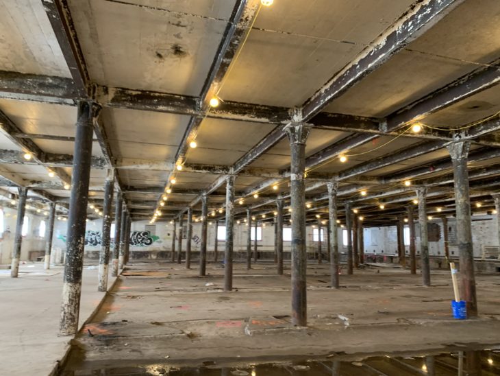 To create floor plates sized for residential use on the upper levels, an atrium is being created by removing sections of concrete flooring (above). Units facing the atrium will have balconies overlooking the space. On the ground floor of the atrium, an interior railcar loading dock (below) will be maintained and one or two restored railcars will become a permanent feature in the lobby area.
