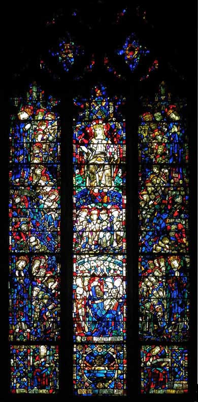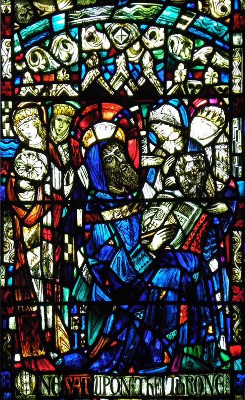 It was dedicated on Trinity Sunday, June 4, 1928. This Te Deum Window is based on the Book of Revelation, which John the Evangelist may have received on the Isle of Patmos. He is depicted in the central panel in an ultramarine gown near the bottom.