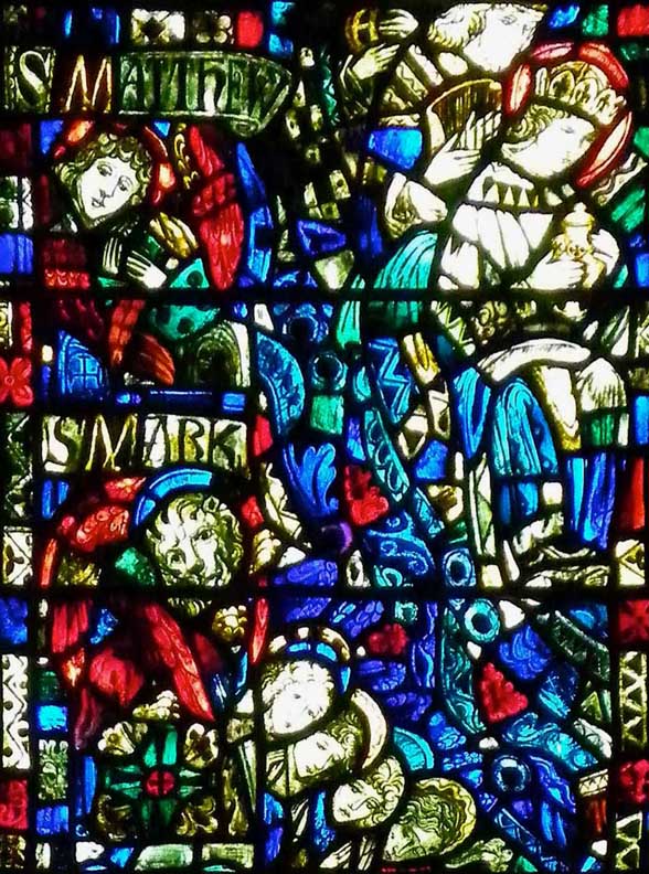 Revelation 4 : 7 The first living creature was like a lion [St. Mark, below] , the second was like an ox, the third had a face like a man [St. Matthew, below], the fourth was like a flying eagle.