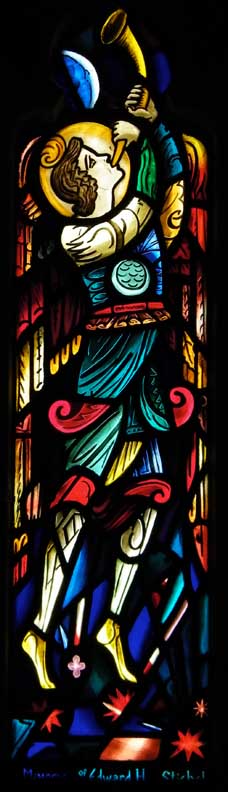 On the left St. Gabriel is shown with his trumpet by which he was known as the announcer of the beginning of things, i.e. the Annunciation to Mary and the Last Day of Judgment. Being closely associated with Mary, Gabriel is symbolized by the crescent moon at the very top of the window and he wears a medallion on his breast. Mary's color is blue and so Gabriel is garbed here in predominant blues.