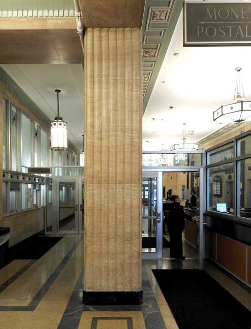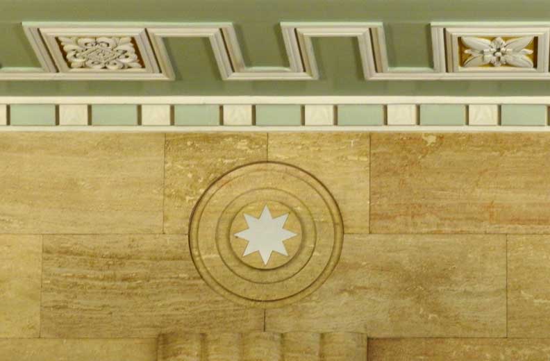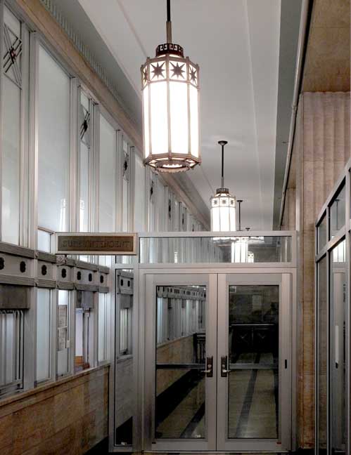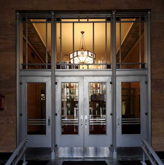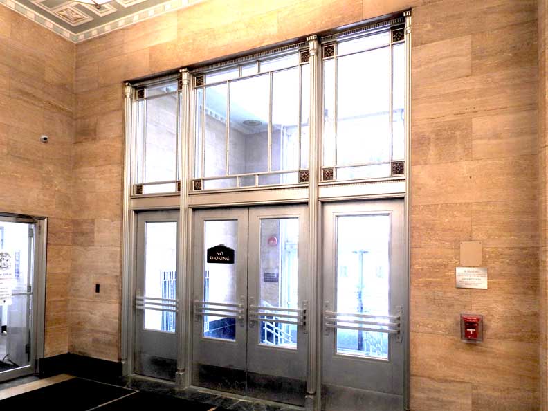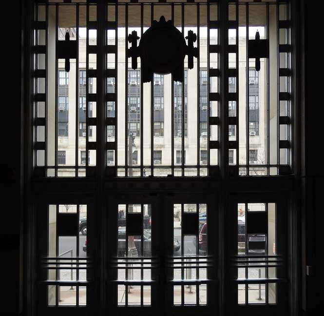 The interior of the building boasts several significant original spaces, including the main lobby, the post office lobby, and the financial lobby. High ceilings and square fluted columns without capitals emphasize the importance of these spaces. The walls and columns are clad in travertine, except where the financial lobby has been remodeled. Details, such as light fixtures, window frames, screens, and desks are cast aluminum. The courthouse floors consist of buff terrazzo bordered in dark green marble. The main lobby is the most ornamented space. Its ceiling features a fretwork molding decorated with polychrome floral panels. Its drum-shaped light fixtures are set in aluminum frames featuring a star motif. The main lobby floor is decorated with stars set within circles made of colored terrazzo. The elevator lobbies retain original dark green marble wainscot and door surrounds, and most of the public corridors retain original terrazzo flooring. There are four original courtrooms in the building: the bankruptcy court on the fourth floor, two ceremonial courtrooms on the sixth floor, and another courtroom on the seventh floor. The bankruptcy court has wood-paneled wainscot with a molded cap, and a dark green marble border and base. The plaster ceiling is ornamented with a cornice and six medallions, from which are suspended original hexagonal bronze light fixtures. The U.S. Courthouse is an example of innovative collaboration between the Federal government and local architects through the site-specific design that stands as a significant architectural presence on Niagara Square. Significant Events 1932: The Emergency Relief and Construction Act authorizes construction of several Federal buildings, including the courthouse in Buffalo. 1933: Two Buffalo architectural firms, Green and Sons, and Bley and Lyman, are retained to prepare plans for the U.S. Courthouse on Niagara Square. 1936: The cornerstone of the courthouse is laid and President Franklin D. Roosevelt dedicates the building. 1987: The courthouse is named after Michael J. Dillon. 2004: The courthouse is nominated to the National Register of Historic Places as a contributing element of the Joseph Ellicott Historic District. Building Facts Architects: Green and Sons; Bley and Lyman Construction Date: 1936 Landmark Status: Contributing element in the Joseph Ellicott Historic District Location: 68 Court Street Architectural Style: Art Moderne Primary Materials: Granite, yellow-gray sandstone, steel Prominent Features: Pentagonal footprint; carved sandstone ornamentation; aluminum details; main lobby and postal lobby; courtrooms |