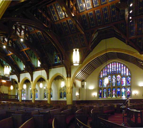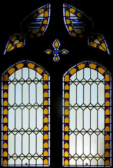 Geometric clearstory window ![]() One of three identical geometric clearstory opalescent stained glass windows ![]() |