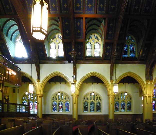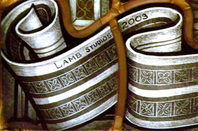 Arcade window: Ascension(?)![]() Are the two large left panels by the Harry Goodhue Studios? (Neither panel is signed but both seem very similar to the other Goodhue windows on this aisle.) The large far right panel is signed by J&R Lamb Studios in 2003. Clearly, it is a replacement panel after the 2001 fire. ![]() Left panel, Ascension(?) By the Harry Goodhue Studios? ![]() Ascension(?) Is the left panel by the Harry Goodhue Studios? (It is not signed but seems very similar to the other Goodhue windows on this aisle.) The large far right panel is signed by J&R Lamb Studios in 2003 (see below). Clearly, it is a replacement panel after the 2001 fire. ![]() Center panel: Ascension(?) By the Harry Goodhue Studios? ![]() Right panel, Ascension(?) Signed by J&R Lamb Studios in 2003 (see next 2 photos). Clearly, it is a replacement panel after the 2001 fire. ![]() Bottom right panel, Ascension(?) ![]() Bottom right panel, Ascension(?) |