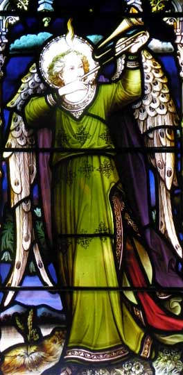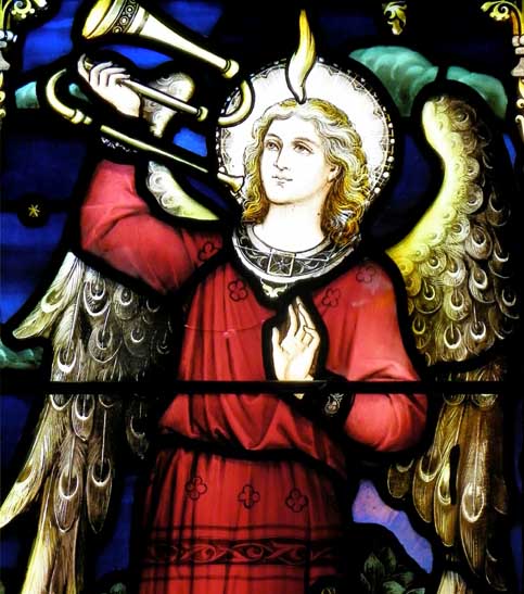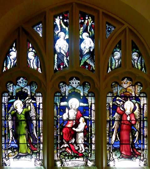 Arcade window: Jesus With Child ![]() Note multi-winged angels. ![]() Left panel - Angel playing musical instrument (Iconography) ![]() Central panel ![]() Right panel - Angel playing musical instrument (Iconography) |