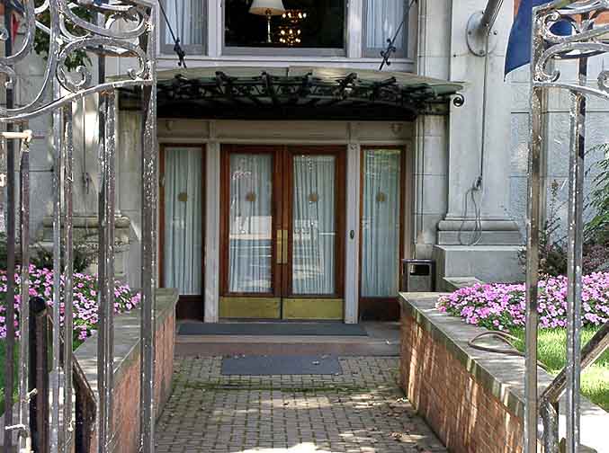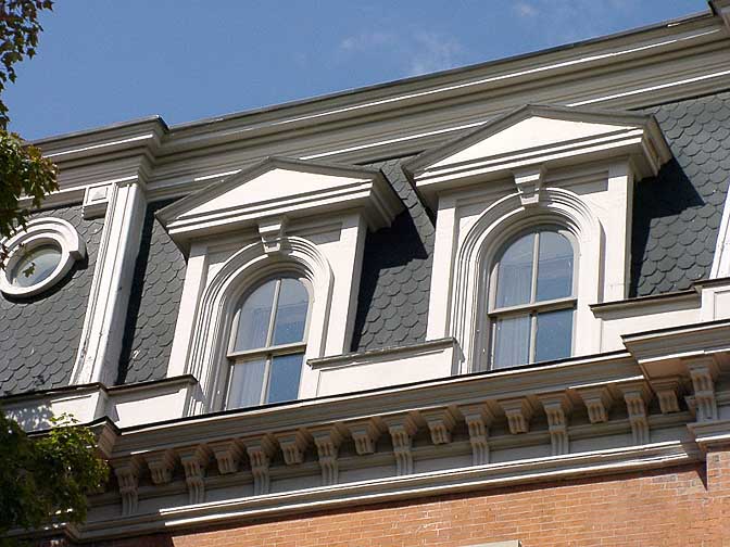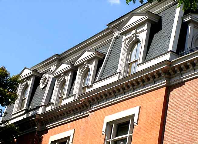 2002 Photographs![]() ![]() 2011 photo ![]() Second Empire style of architecture ![]() ![]() Front entrance on Delaware Ave. ![]() Front entrance on Delaware Ave. Wrought iron fence appears silver because of reflecting sun ..... Paired entry doors ![]() Mansard roof (straight) with dormers ![]() Pedimented dormers ..... Keystone in round-arch window surrounds ..... Two-over-two double-hung sash ..... Upper sash has rounded glass ..... Windows flanked by pilasters ![]() Ornamental brackets "support" cornice ![]() ![]() Three-sided bay ..... Engaged columns ![]() Side entry on north side (right) of building. ![]() Note reddish color bricks on north side that are different from the more orange color in previous photos. ![]() Ornamental brackets "support" cornice ![]() Classical egg-and-dart band ..... Stylized drops ![]() Trinity Episcopal Church is directly across the street from the club Trinity