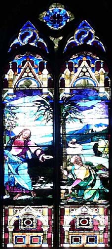 Resurrection Window or Noli Me Tangere Based on a painting by Florentine Renaissance artist, Lorenzo deCredi, the window shows Mary Magdalene returning to the empty tomb and mistaking the risen Christ for a gardener. He holds a hoe in his right hand. When she then recognizes Him and reaches out, he tells her, "Do not hold on to me, because I have not yet ascended to the father," and sends her to tell the disciples. Thelandscape features a palm tree, a symbol of victory over death, and Jerusalem is suggested in thebackground. Given by Charlotte Sherman Watson in memory of her husband, Stephen van Renssalaer Watson, a vestryman of the old Trinity church. |