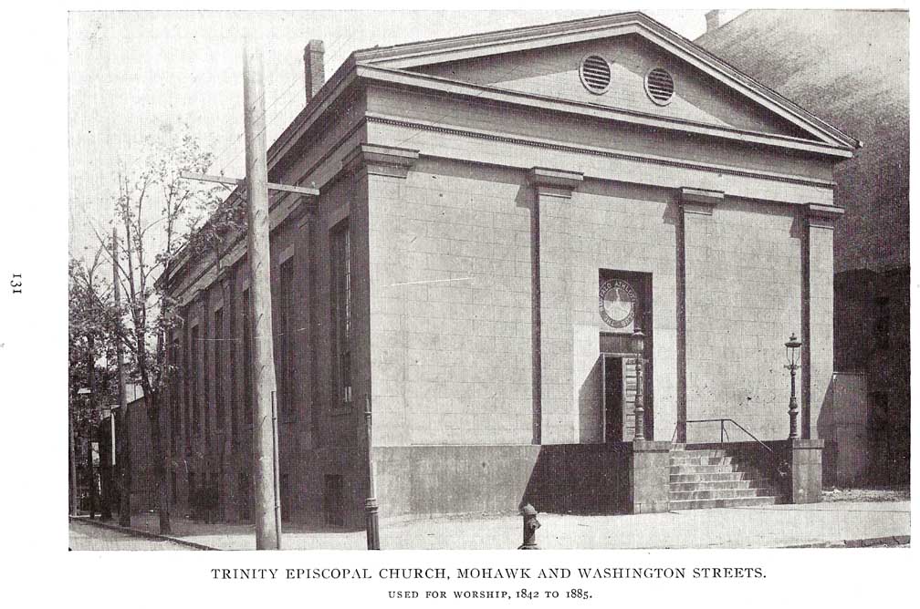 The first Trinity Church on on Washington and Mohawk Streets ... The first service was conducted in the partially completed building in December, 1842 ...