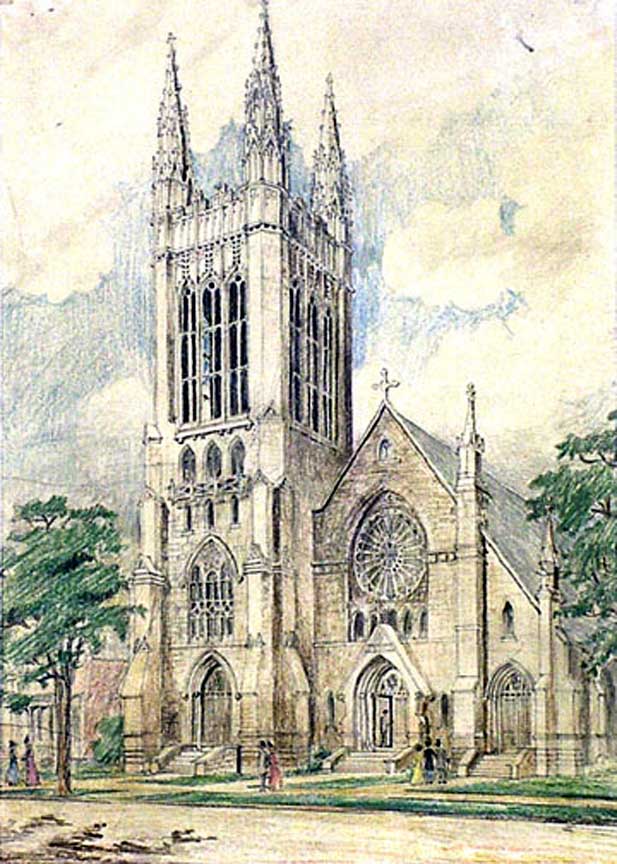Arthur Gilman's design for Trinity Church at Delaware and Johnson Park -- never built ... Illustration source: Trinity Episcopal Church archives