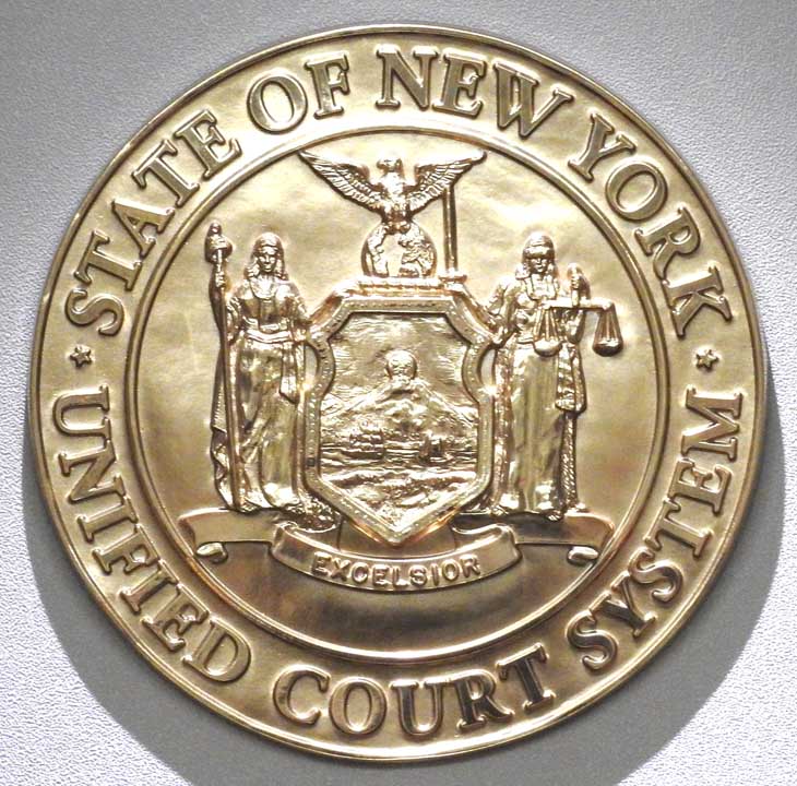 ![]() New York State Seal. The center shield displays a masted ship and a sloop on the Hudson River (symbols of inland and foreign commerce), bordered by a grassy shore and a mountain range in the background with the sun rising behind it. Liberty and Justice support the shield and an American eagle spreads its wings above on a world globe. Liberty's left foot treads on a crown (a symbol of freedom from the Kingdom of Great Britain). Justice is blindfolded and holds a sword in one hand and a scale in the other, symbolizing impartiality and fairness. |