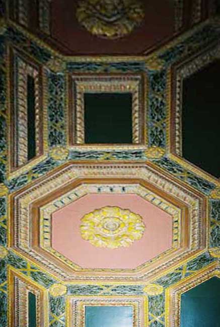 Aug. 2004 photo. Typical rosette and medallion etc. which cover the ceiling of the main living room