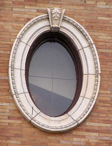 Window to the left of the carriage entrance. Stone surround: