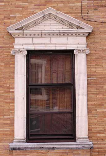 Pediment (triangle) with raking cornice has dentil course and an undecorated brick tympanum in the center. Fluted Ionic pilasters on either side of light (window).