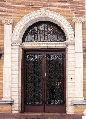 2003 photo. Round arched front entrance has paired fluted Ionic pilasters flanking double glass paneled door with ornamental cast iron grill work. Semicircular transom with keystone above in the surround.