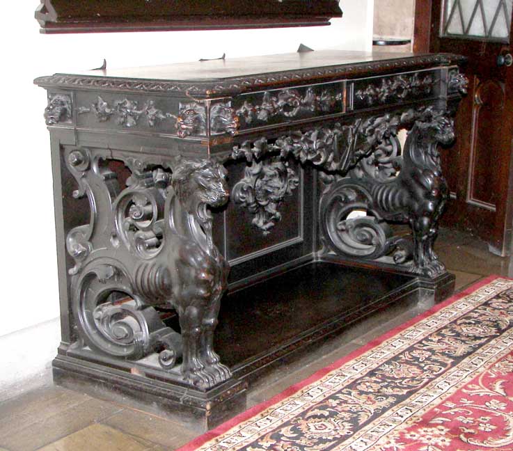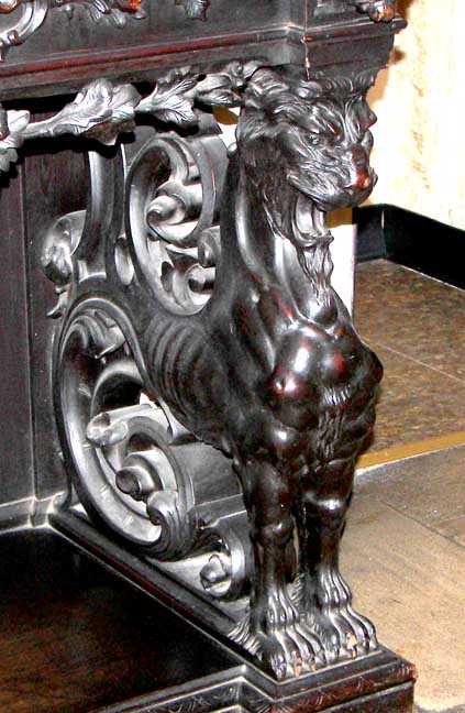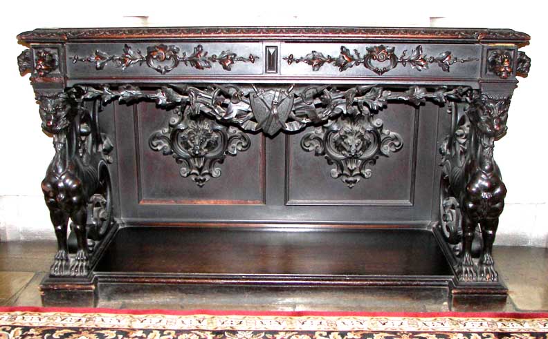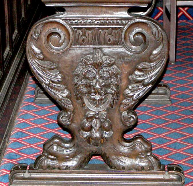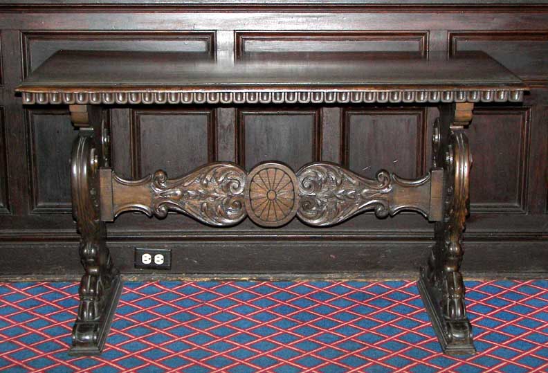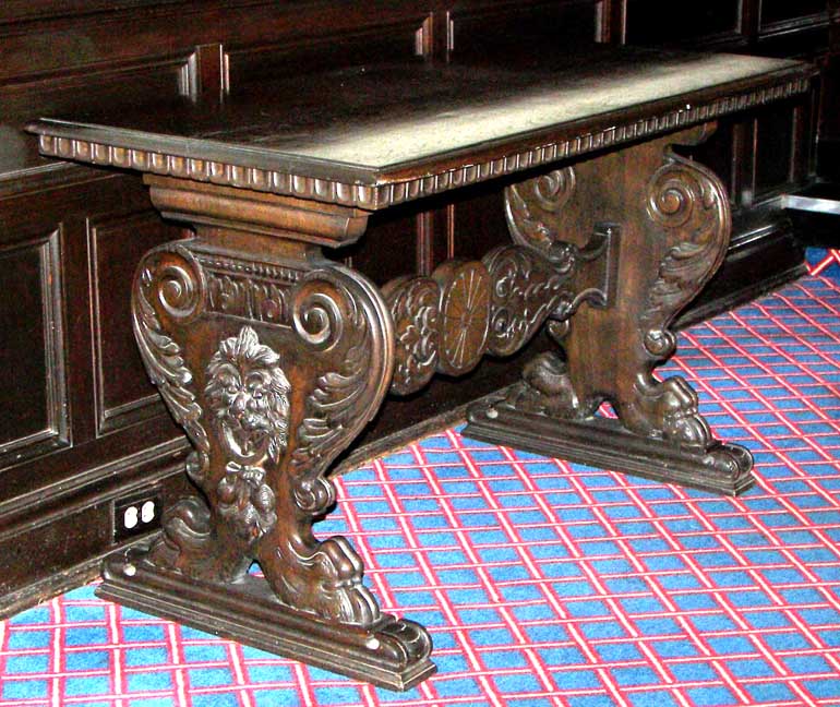 ![]() Trestle table with carved stretcher ![]() Detail #1 - Acanthus leaves flank sunburst on stretcher ![]() Detail #2 - Scoop pattern molding under top ... Carved stiles ![]() Detail #3 - Carved stiles: acanthus leaves ... Lion head and paws |