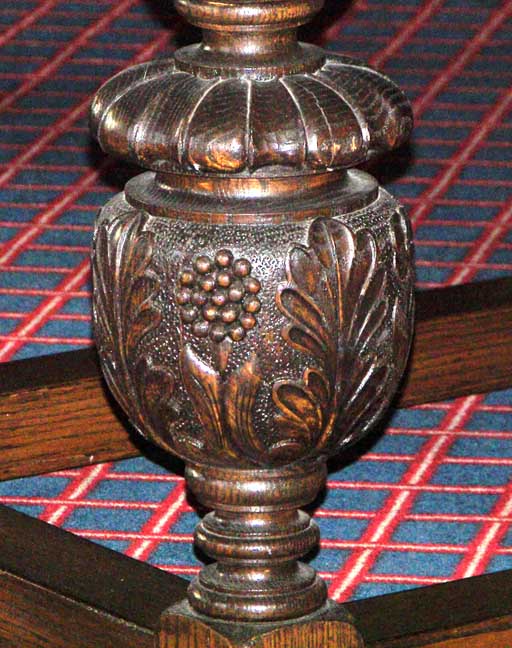 ![]() Table: Carved skirt ... Turned, bulbous legs ... Rectangular stretchers ... Detail below: ![]() Leg with gadroons and bulbous leg with flower and acanthus leaves |