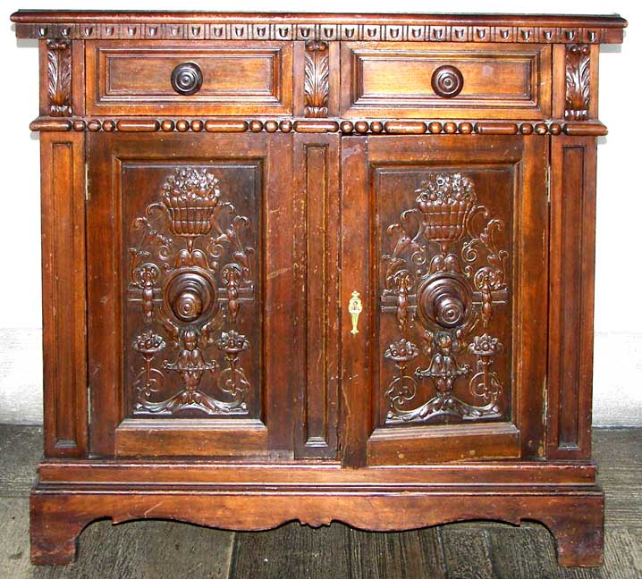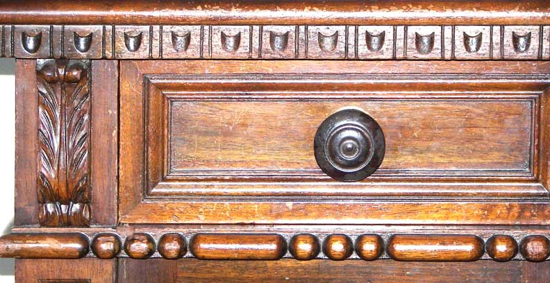 ![]() Sideboard with full-length drawer and 2-door cupboard with carved panels ... Two details below: ![]() Detail #1 - Top gouge carving ... Acanthus leaf ornament flanks drawer ... Bead-and reel molding ![]() Detail #2 - Carved panel |