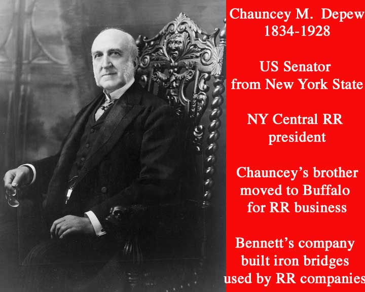 Depew Avenue is named in honor of Chauncey M. Depew [1834-1928], a statesman, U.S. Senator, counselor, orator, and President of the New York Central Railroad. It is not known where or when Depew and Lewis Jackson Bennett actually first met, but the two were undoubtedly familiar with each other in light of their respective business and political activities in the late 1800s. Like Bennett, Depew was the son of a farmer. He was born in the downstate community of Peekskill, New York, on April 23 , 1834.... Depew attended Yale, graduating in 1856... Depew studied law and was admitted to the bar in 1858. Like Bennett, Depew became involved in politics early in his career. Both were active members of the Republican party ... Indeed, Depew was a delegate at the 1856 Republican Party convention. Like Bennett, Depew was a staunch supporter of Abraham Lincoln in the 1860 election. While Bennett was an elected official in Johnstown and was appointed as the collector of toll for the Erie Canal in Fultonville in 1861, Depew was serving as a member of the New York State Assembly. In 1863, Depew became Secretary of State for New York State. In 1866, Depew turned down a second term of Secretary of State and went back into private practice as attorney for the New York & Harlem Railroad. Subsequently Depew became associated with Cornelius Vanderbilt and eventually was named President of the New York Central Railroad and various smaller railroads Under Depew's direction, the New York Central Railroad system greatly expanded. Bennett and Depew had a Buffalo connection as well. It is possible that Bennett and Chauncey Depew met through William B. Depew, Chauncey's brother who moved to Buffalo in 1864. William Depew moved to Western New York (two years earlier than Bennett) to manage affairs for various railroad enterprises. Inasmuch as Bennett's company was responsible for building many of the iron bridges used by the railroads in Western New York, he and William Depew were certainly acquainted. Depew's nephew was Ganson Depew, a vice president of the Buffalo & Susquehanna Coal Company, and the personal assistant of his father-in-law Frank Henry "F.H." Goodyear. ![]() |