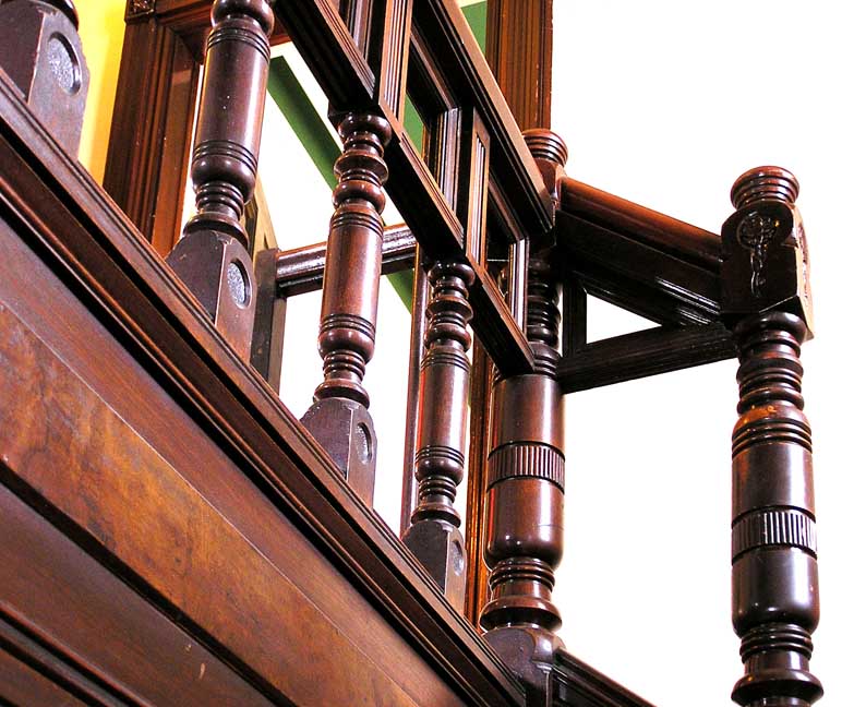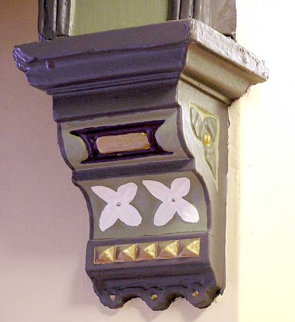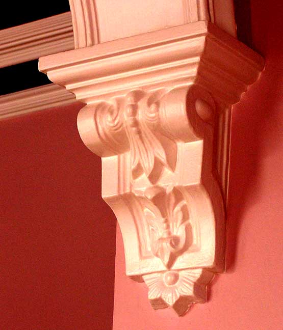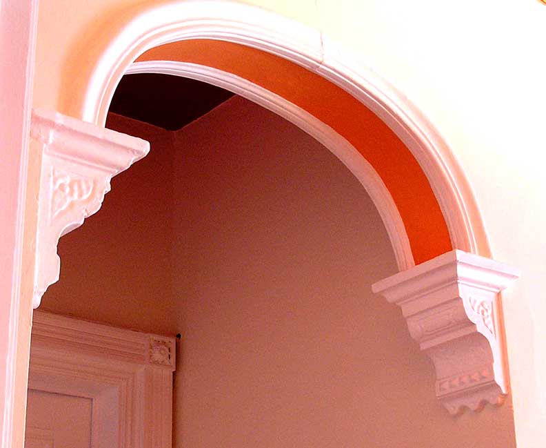 2005 photos![]() Second floor turned balusters ![]() ![]() Second floor front bedroom plaster basket-handle arch ... Note supporting corbels (detailed below:) ![]() Foliated cloth-reinforced plaster corbel ![]() Second floor middle bedroom plaster basket arch ![]() Painted cloth-reinforced plaster corbel ![]() Painted cloth-reinforced plaster medallion ![]() Painted cloth-reinforced plaster medallion ![]() Foliated door handle |