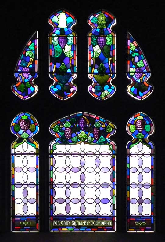 E. Goodhue All six nave windows are identical except for the different Beatitude written on each window. The Second Beatitude (... for they shall be comforted) is written on this window. All panels feature grape vines. LARGER SIZE beneath top photo |