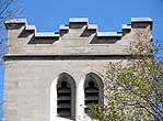 The front tower: battlement; belt course; paired windows |