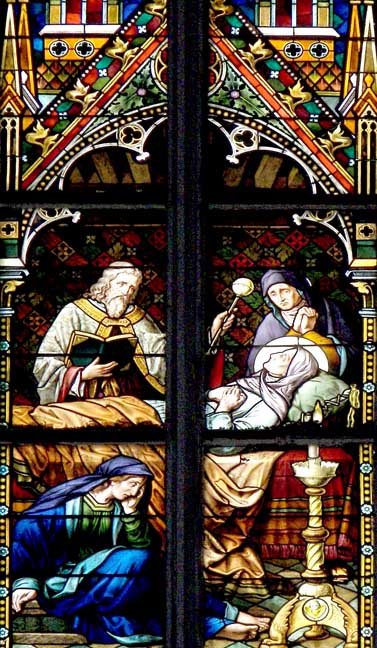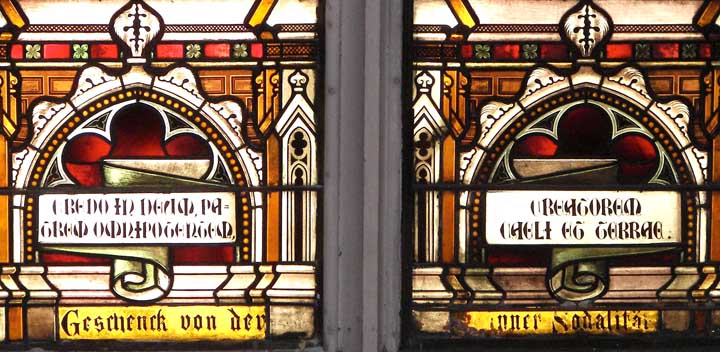 The 35 stained glass windows were created by German glass makers in Munich under the direction of Franz Xavier Zettler (1841-1916) who employed 300 craftsmen and did a worldwide business, including many American churches. St. Ann's windows were shipped to the US in 1889 and installed in 1890.The five upper windows of the east transept, the five windows of the sanctuary, and the five upper windows of the west transept - fifteen in all - represent scenes from the Legend of Saints Ann and Joachim, the parents of Mary who was the mother of Jesus.