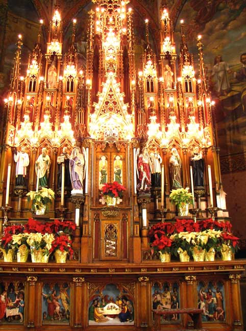 The altar, rising to a height of thirty-two feet, is completely doweled. It is adorned with 153 lights