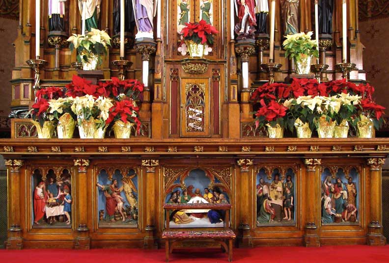 Five reliefs - each a wood panel - adorn the front of the altar: