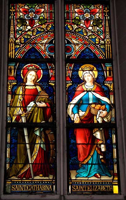 The stained glass windows near the Blessed Mother's altar depict Saints Catharine of Austria and Elizabeth of Hungary